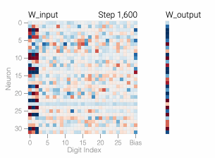 モデルのアーキテクチャも同じくらい単純で、 という 24 ニューロンの一層 MLP です。モデルの全重みは下のヒートマップに表示してあり、上の折れ線グラフにマウスオーバーすると学習中の変化が確認できます。
