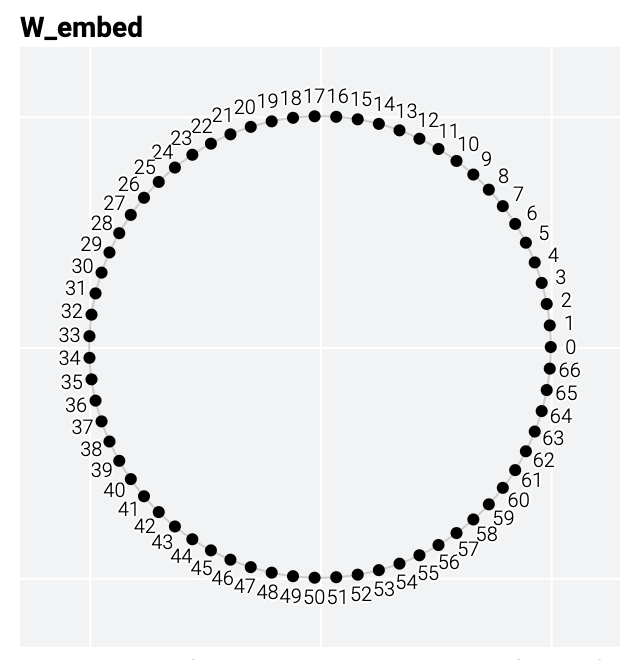 というモジュラー演算の問題は本質的に周期的で、合計が 67 を超えるたびに答えが巻き戻ります。数学的には、 と を円周上に並べるとイメージしやすく、汎化したモデルの重みにも周期的なパターンが現れていました。この性質を利用しているのかもしれません。